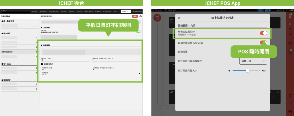 - 後台時間設定:平日用餐限時 120 分鐘;假日用餐限時 90 分鐘。