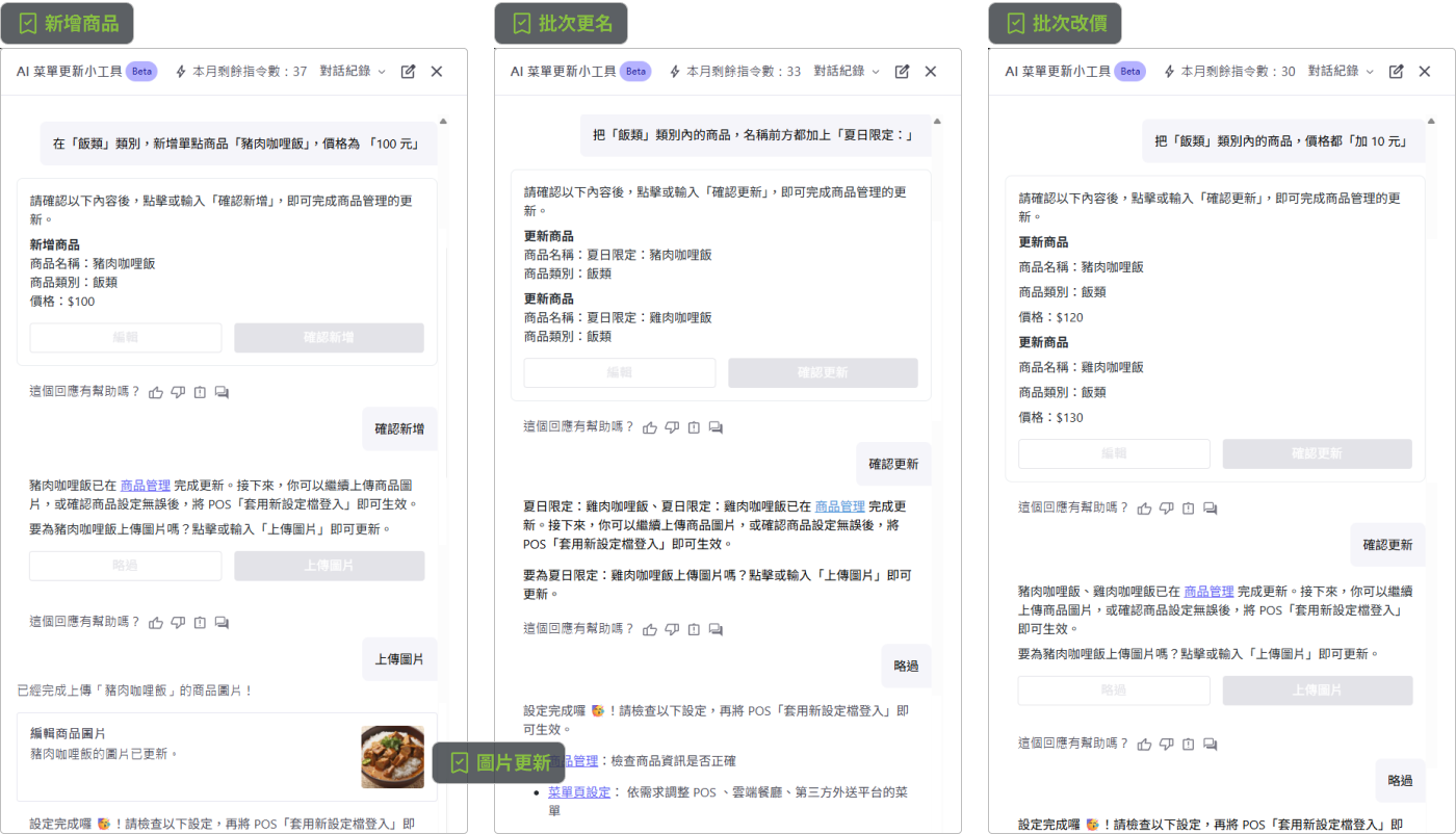 新增商品或需要調整多個商品,不必再一項項處理。現在,只要用文字描述需求,就能快速完成設定,讓日常管理更省時、更高效。